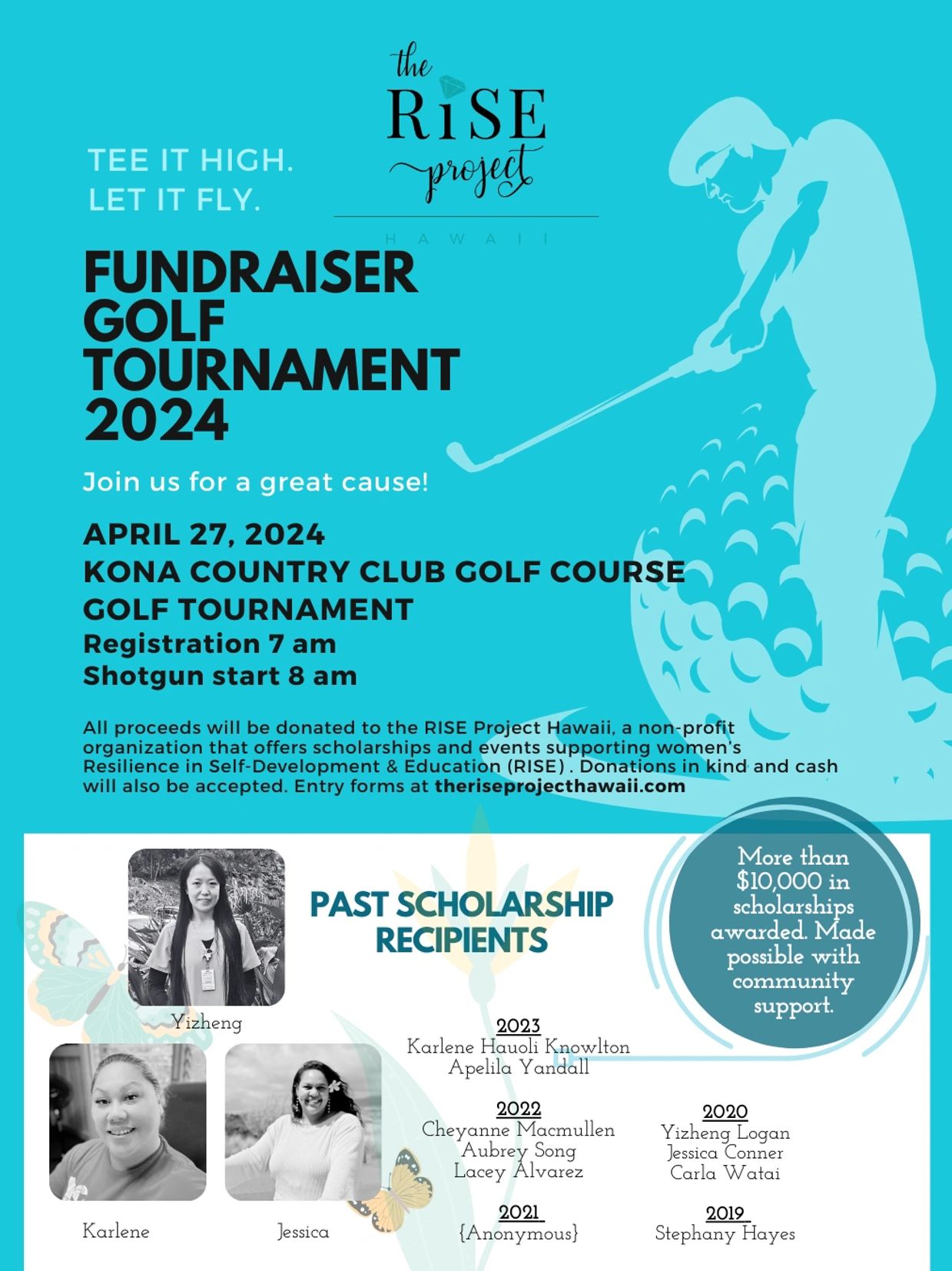 The RISE Project Hawaii will be hosting our first fundraiser golf tournament on April 27, 2024 at the Kona Country Club golf course. Registration begins at 7am, shotgun start at 8 am, with lunch to follow immediately afterwards.